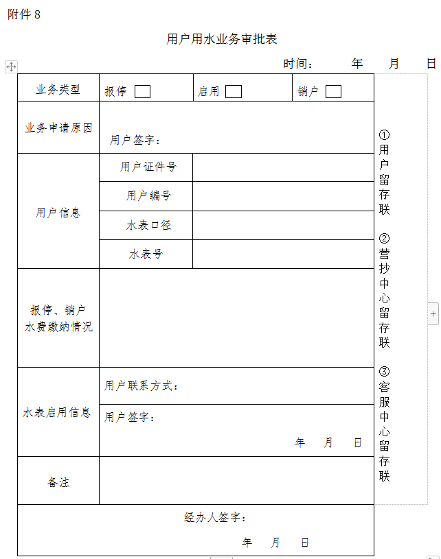 9.《荊門市供水總公司“一站式服務(wù)”業(yè)務(wù)受理登記表》