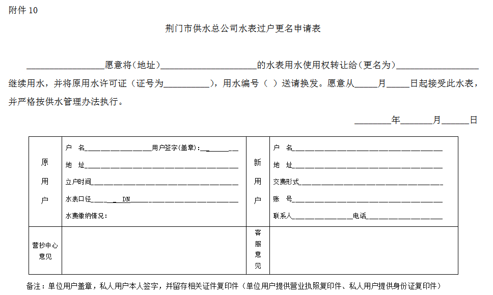 10.《荊門市供水總公司水表過(guò)戶更名申請(qǐng)表》