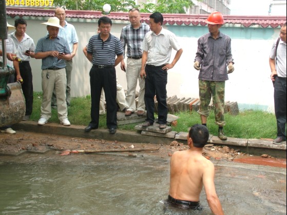 7月16日上午1030左右,白云大道老水泥廠門口DN1200米供水主管突然爆裂,導(dǎo)致城區(qū)水壓降低,白云大道鐵路大橋以北、塔影路口以南地段、天鵝路等處部分用戶停水,市供水總公司組織送水車為停水地段用戶送水,經(jīng)全力搶修,于下午3時(shí)30分恢復(fù)供水。圖為搶修現(xiàn)場(chǎng)。