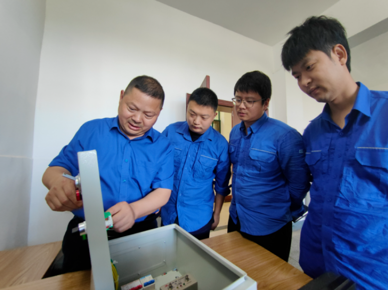 賈師傅(左一)與青年員工研究電路接駁