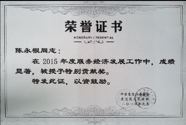 近日,公司因服務(wù)“四區(qū)兩園”成績(jī)突出,黨委書(shū)記、總經(jīng)理陳永根被東寶區(qū)委、區(qū)政府授予“服務(wù)經(jīng)濟(jì)發(fā)展工作特別貢獻(xiàn)獎(jiǎng)”。