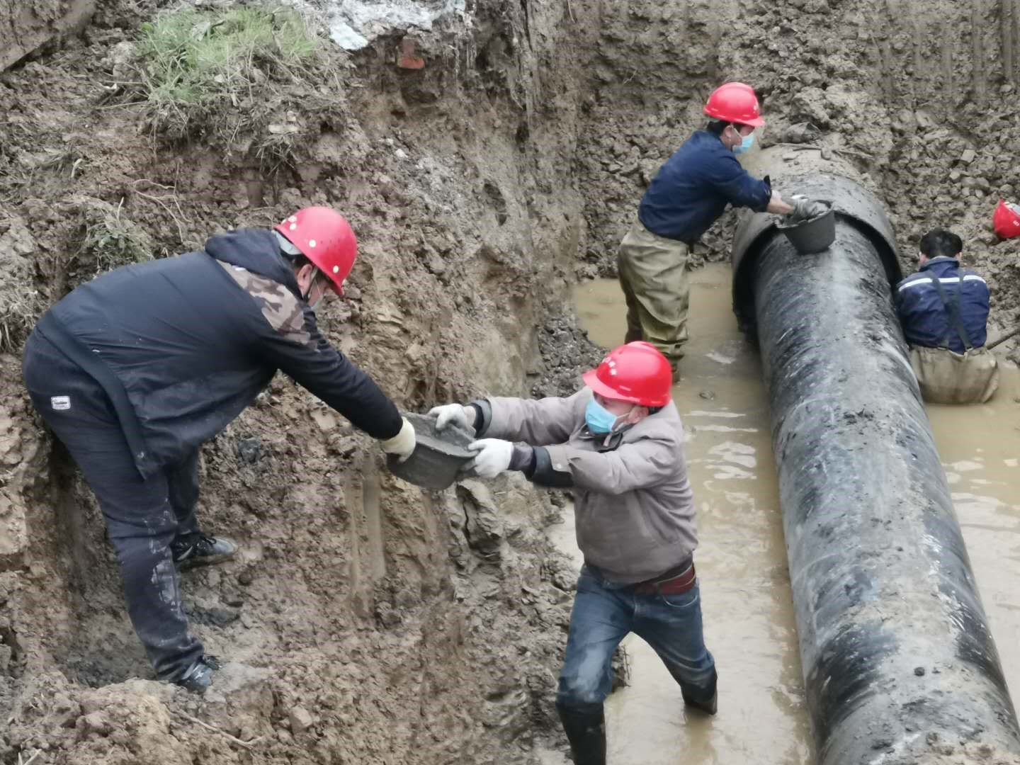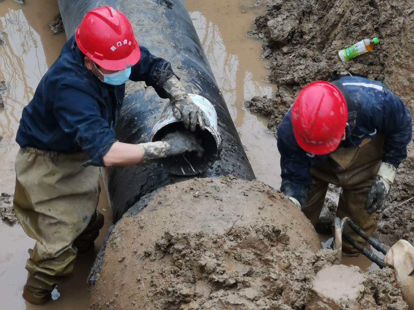 2月23日10時(shí),掇刀區(qū)迎春大道人福藥業(yè)門(mén)前DN600mm主供水管道突發(fā)爆管,供水維修部門(mén)迅速啟動(dòng)疫情期間應(yīng)急搶修預(yù)案,組織人員、工程機(jī)械、維修設(shè)備趕赴現(xiàn)場(chǎng),經(jīng)過(guò)9個(gè)多小時(shí)的緊張搶修,于當(dāng)日晚7點(diǎn)42分恢復(fù)了供水。緊接著次日8點(diǎn),東寶區(qū)科陽(yáng)路DN600mm主供水管道突發(fā)爆管,巡查人員現(xiàn)場(chǎng)核實(shí)后迅速止水,并及時(shí)通告用戶(hù)停水信息后開(kāi)始倒閘排水,到13時(shí)左右開(kāi)挖出爆管的DN600的主供水管道出現(xiàn)在大家面前,相比前日的搶修,整段水管因裂口較大損壞嚴(yán)重,不能簡(jiǎn)單修復(fù),只能現(xiàn)場(chǎng)立即制定可靠的管道更換維修方案。當(dāng)時(shí),全部工作人員從早上到現(xiàn)場(chǎng)已經(jīng)工作了5個(gè)小時(shí),滴水未進(jìn),但大家為保障搶修進(jìn)度,仍然堅(jiān)持一邊加班加點(diǎn)對(duì)基坑進(jìn)行處理,一鼓作氣將破損管道清理出來(lái),做好對(duì)接管道的清淤工作。另一邊搬運(yùn)快干水泥,切割、加工、運(yùn)輸、吊裝管道,14點(diǎn)35分把全部材料物資運(yùn)抵現(xiàn)場(chǎng)開(kāi)始作業(yè)。隨后,大家在泥地里匆匆啃了幾口方便面后,又投入到緊張的搶修工作中,終于在18點(diǎn)17分完成了維修,待水泥養(yǎng)護(hù)好后,于21點(diǎn)27分通水,及時(shí)保障了科陽(yáng)路企業(yè)和周邊居民的正常生產(chǎn)生活用水。