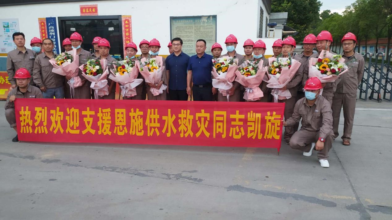 回想起赴恩施市的六天時(shí)間應(yīng)急供水救援經(jīng)歷,應(yīng)急供水救援隊(duì)隊(duì)長(zhǎng)、維修公司副經(jīng)理羅紅勝回憶到,面對(duì)洪災(zāi)侵襲,大家總是在披星戴月與時(shí)間賽跑,連軸戰(zhàn)斗,一處受損設(shè)備、斷裂管道剛剛修復(fù),來(lái)不及休息,馬不停蹄又趕往下一個(gè)搶修點(diǎn)。他感慨地表示,赴恩施市救援不管怎么艱苦也沒(méi)什么,留下深刻的印象是特別熱情的當(dāng)?shù)厥忻袢罕姾退麄兊恼嬲\(chéng)謝意。赴恩救援期間,公司黨委也十分關(guān)心8名灰衣甲士的后勤保障工作。7月25日下午,黨委書(shū)記、總經(jīng)理陳永根,黨委副書(shū)記、紀(jì)委書(shū)記徐黎明,黨委委員、總會(huì)計(jì)師劉高軼出差路過(guò)恩施期間專(zhuān)程慰問(wèn)作戰(zhàn)人員,并要求公司相關(guān)部門(mén)全力做好住宿、就餐等后勤保障工作。
