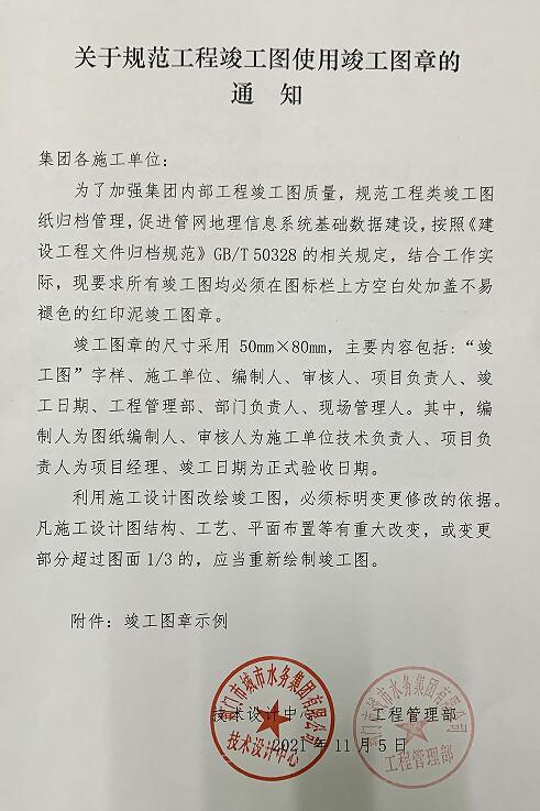 近日,技術(shù)設(shè)計(jì)中心為了加強(qiáng)集團(tuán)內(nèi)部工程竣工圖質(zhì)量,規(guī)范工程類竣工圖紙歸檔管理,促進(jìn)管網(wǎng)地理信息系統(tǒng)基礎(chǔ)數(shù)據(jù)建設(shè),聯(lián)合工程管理部編發(fā)了規(guī)范工程竣工圖使用竣工圖章的要求和指導(dǎo)意見。